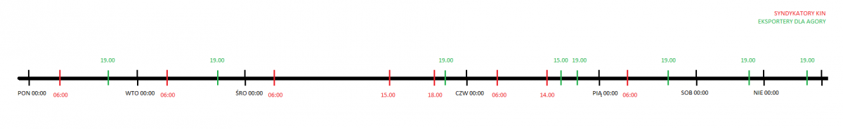 Syndykatory kin uruchamiane są od poniedziałku do piątku między 06:30 a 07:00, dodatkowo w środy o 15:30 i 19:05 oraz w czwartki o 15:30.