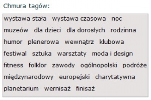 - wystawa stała, wystawa czasowa - tagi rozłączne, wstawiane w imprezach z kategorii kultura/wystawa;